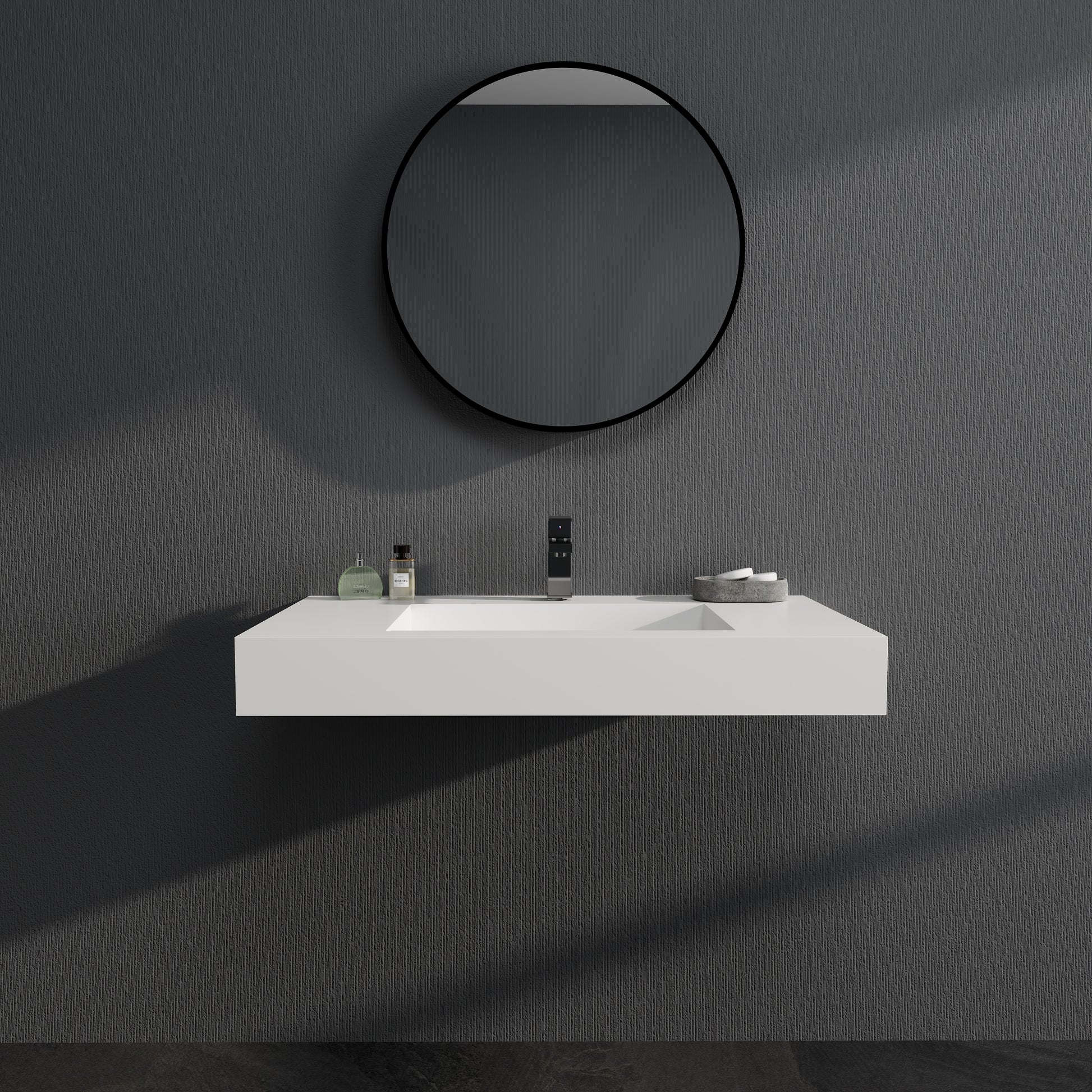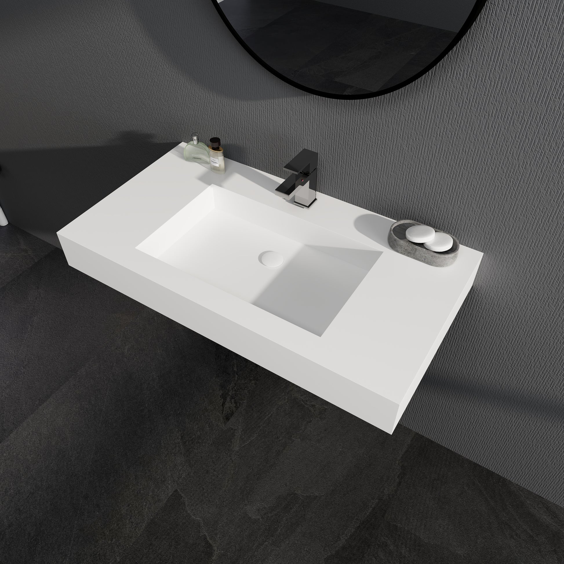 Made of high-quality artificial stone, sturdy and wear-resistant, one matte white color is pure, stain-resistant and easy to clean. Standard rectangular design, sharp lines, easy to integrate into various bathroom styles. Wall-mounted installation, presenting the visual effect of levitation, saving space without dead ends. (Include installation screws | open faucet hole | without waste)
