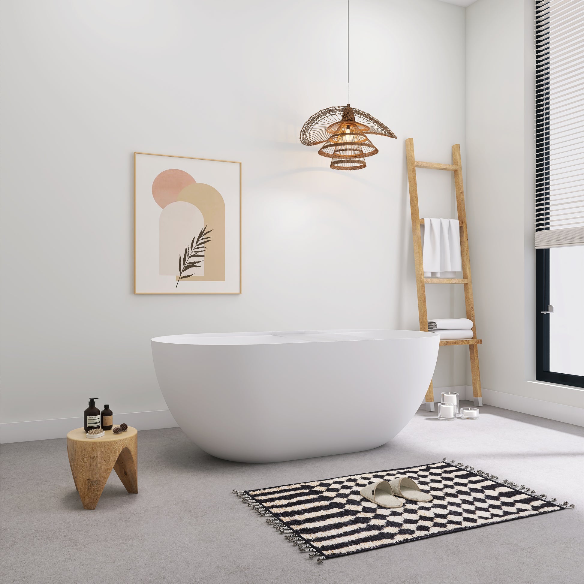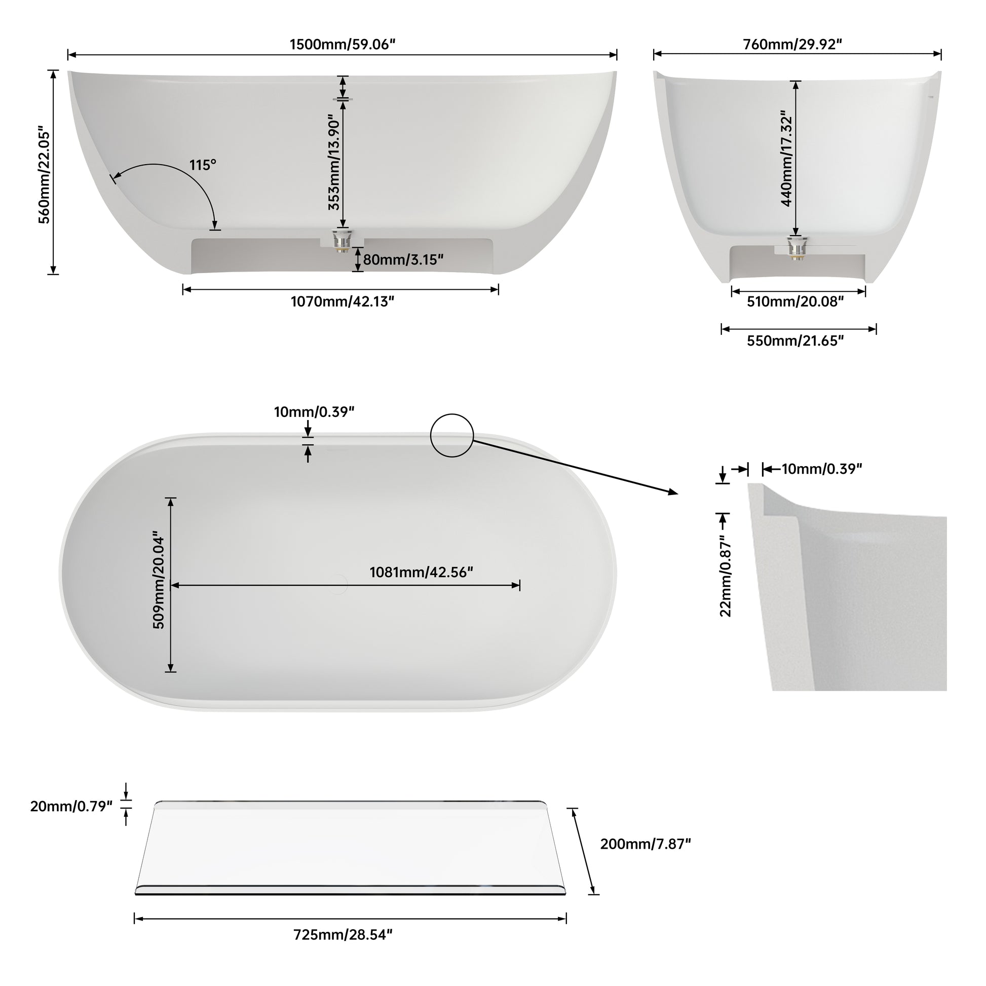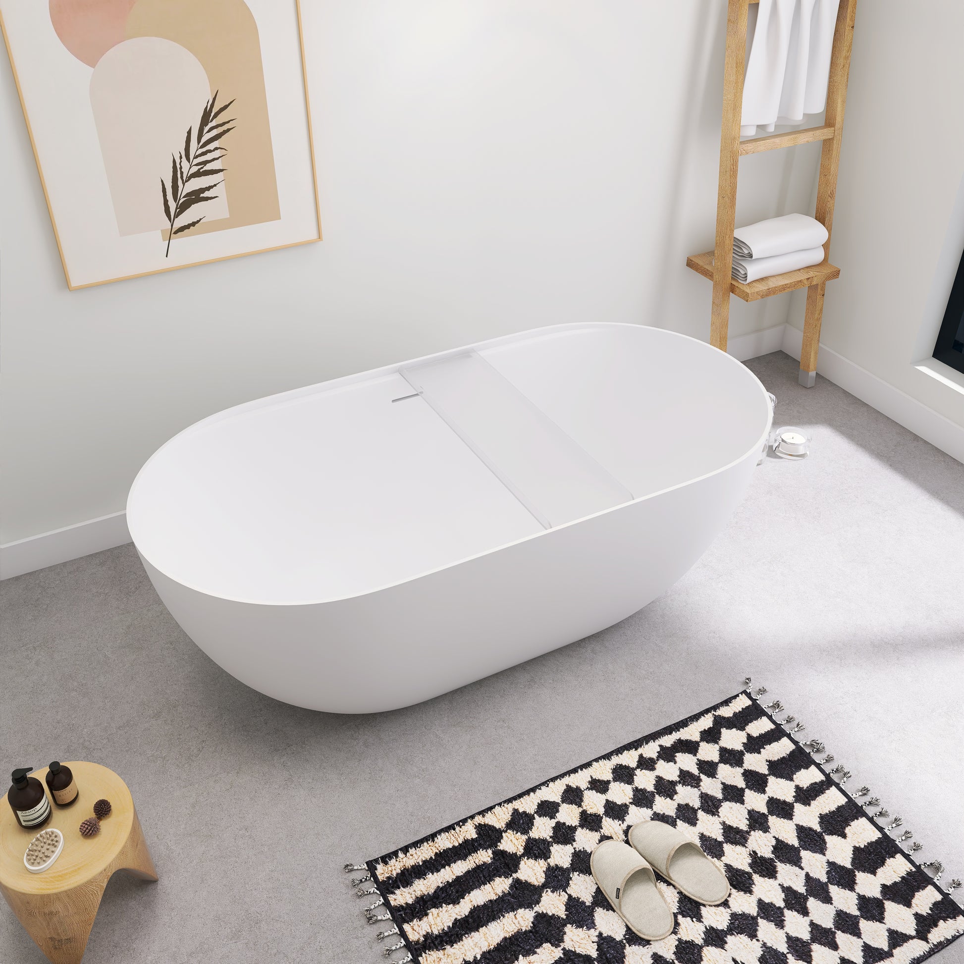 This freestanding bathtub is made of high-quality artificial stone (solid surface material), which combines elegant texture and excellent durability, adding a premium feel to the modern bathroom. The bathtub features a deep soaking design with an ergonomic curved backrest that provides an immersive bathing experience, effectively relieving muscle fatigue and allowing for complete relaxation. Innovative acrylic shelf design, can be easily placed in the bath supplies, aromatherapy or electronic equipment, both practicality and aesthetics, so that the bath time more cozy. The surface of the bathtub has been treated with anti-slip, which is warm and delicate to the touch, ensuring safety and comfort. Freestanding installation is flexible and convenient, suitable for different bathroom styles, and you can enjoy high-end bathing experience without complicated construction. With the advantages of anti-fouling, high temperature resistance, easy to clean, etc., the bathtub can still be used for a long time to keep clean as new.Includes pop-up drain with bottom drain in the center and drain hose (priced separately)