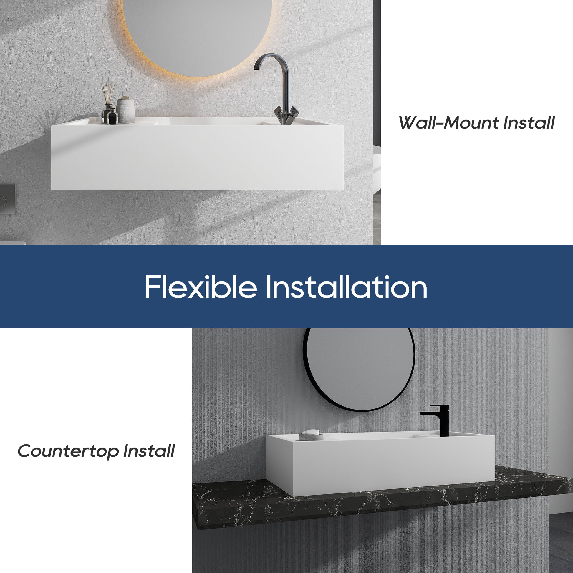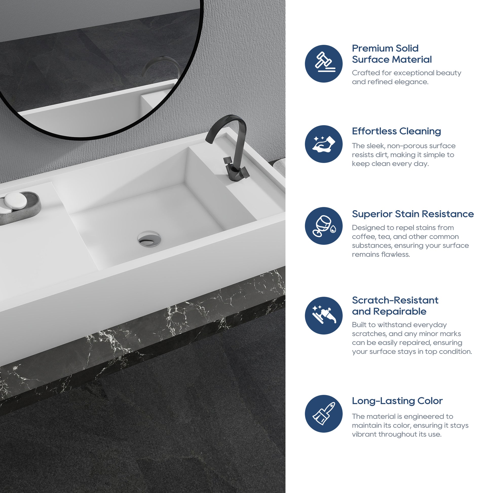 Built with high-density solid surface material, the surface is smooth and easy to clean, anti-dirt and anti-penetration. Right single faucet hole design, ergonomic, more convenient operation.