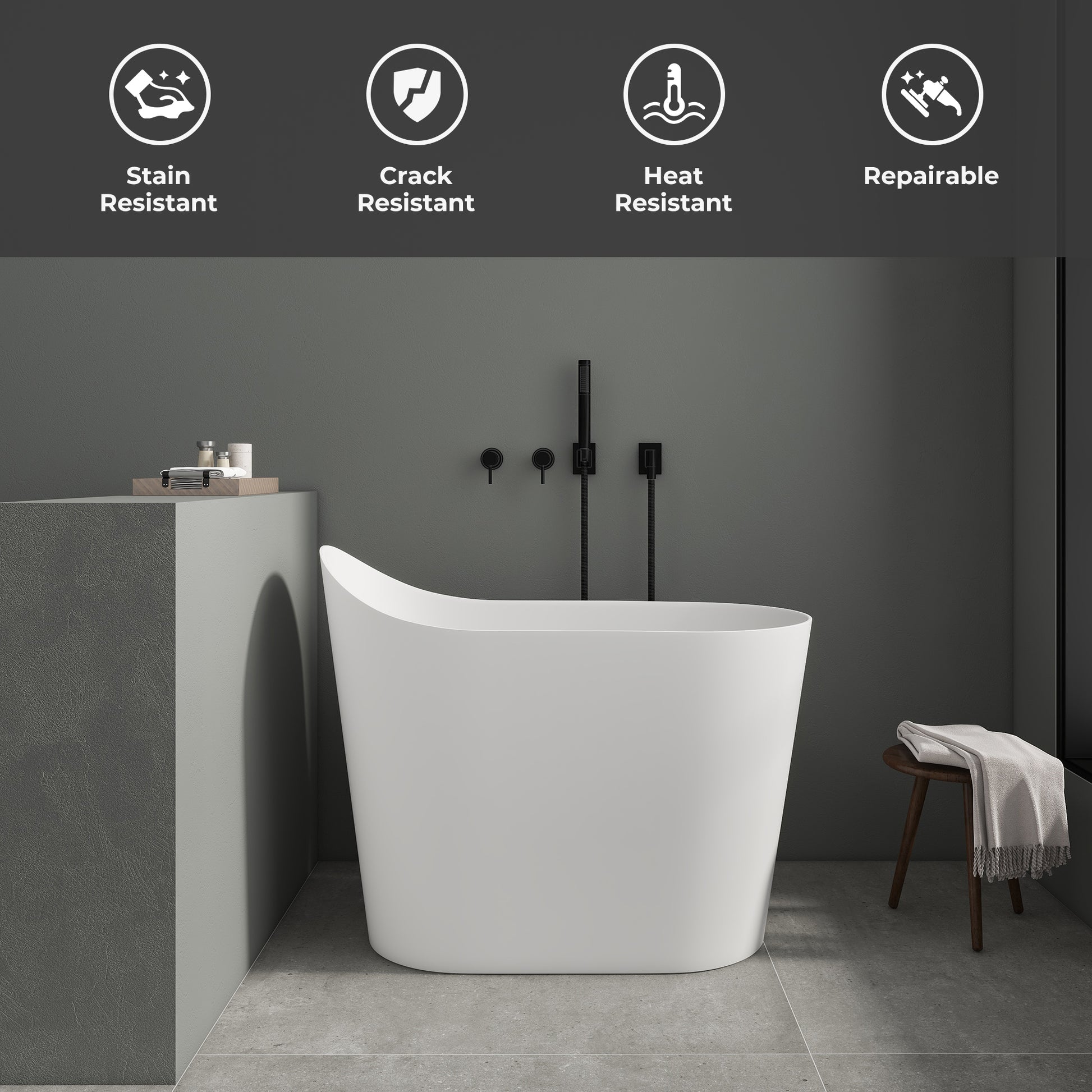 Using natural resin stone one-piece molding, non-porous anti-fading design, presenting real stone texture and silky smooth touch. Special material can repair minor scratches, anti-fouling and high temperature resistant, more worry about cleaning. Ergonomic tilting backrest perfectly supports the waist and neck, non-slip matte surface to ensure safety. Excellent heat preservation performance locks the temperature for a long time, prolonging the comfortable soaking time. Adaptable to both indoor and outdoor scenes, with centralized drainage system, with a drain and drainpipe. Freestanding styling creates a modern bathroom focal point, making everyday bathing a healing time.