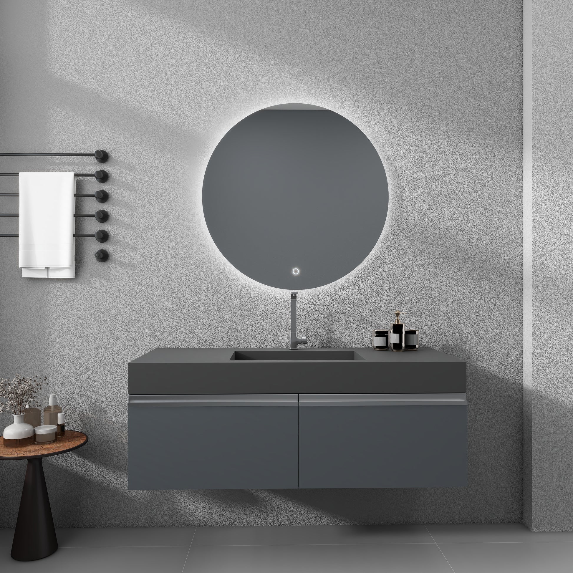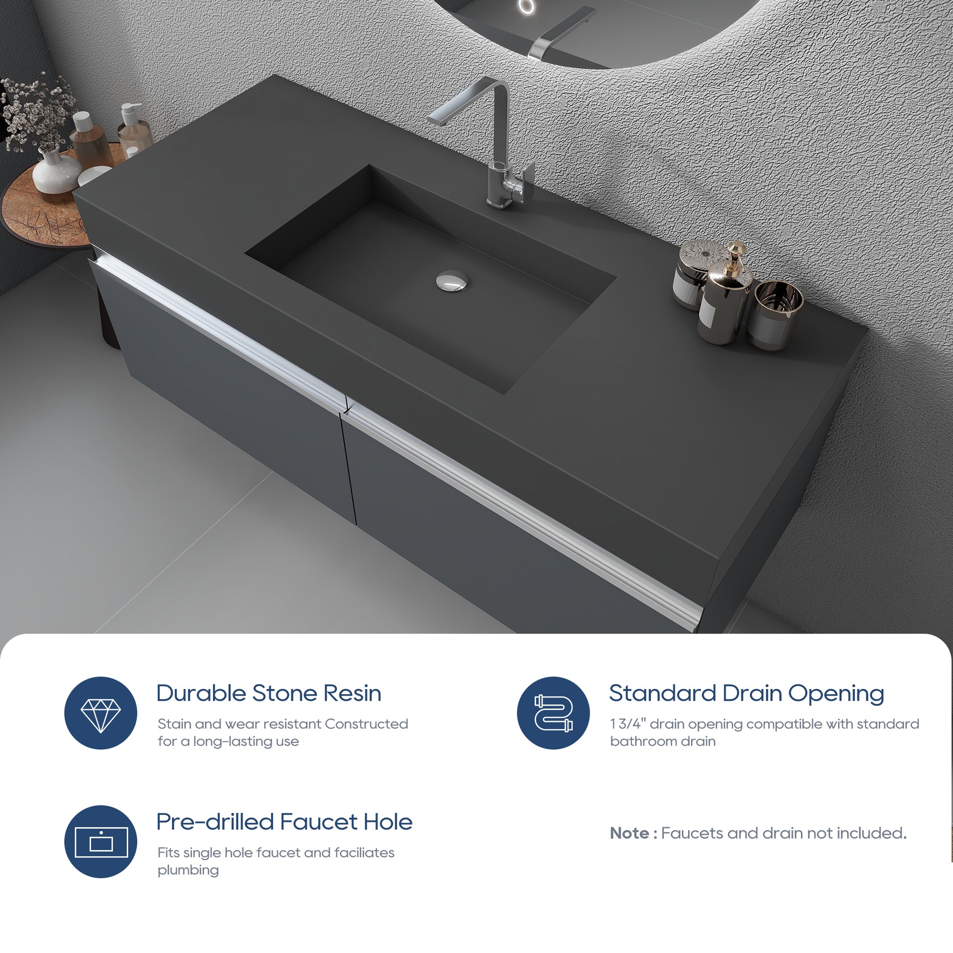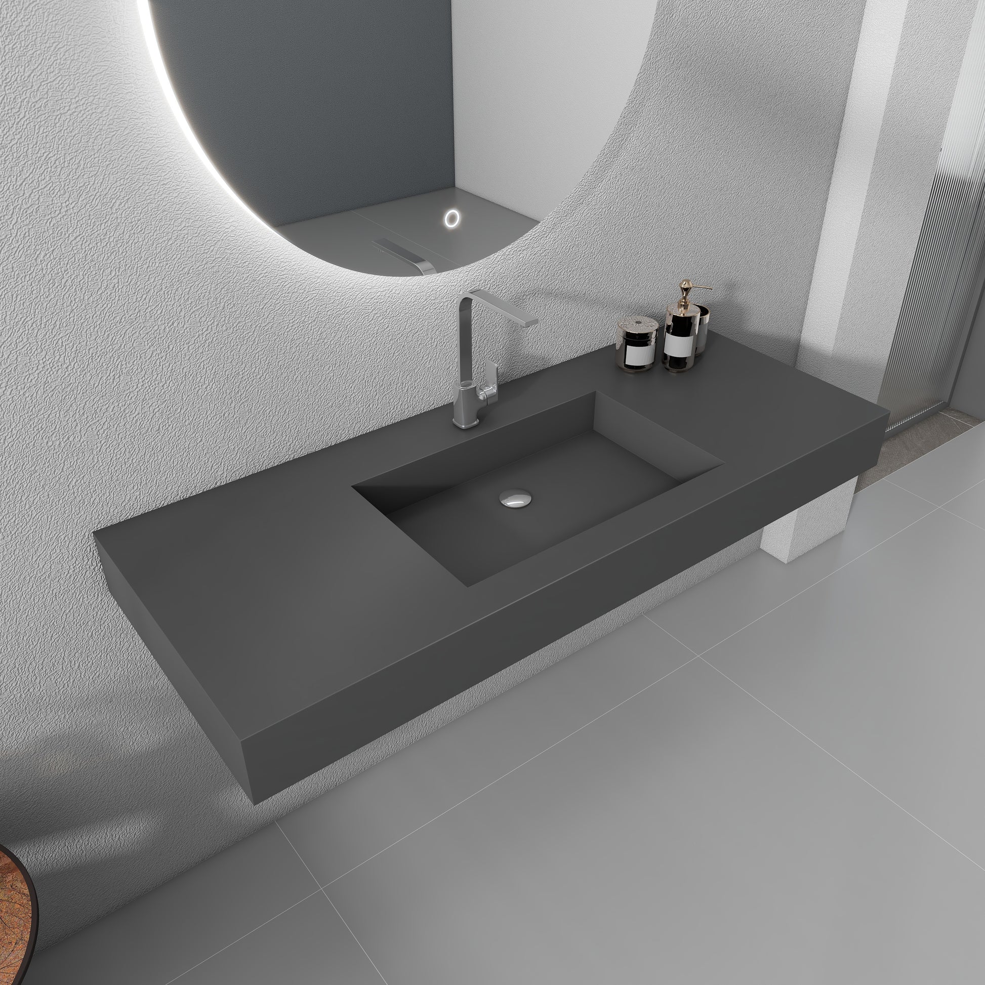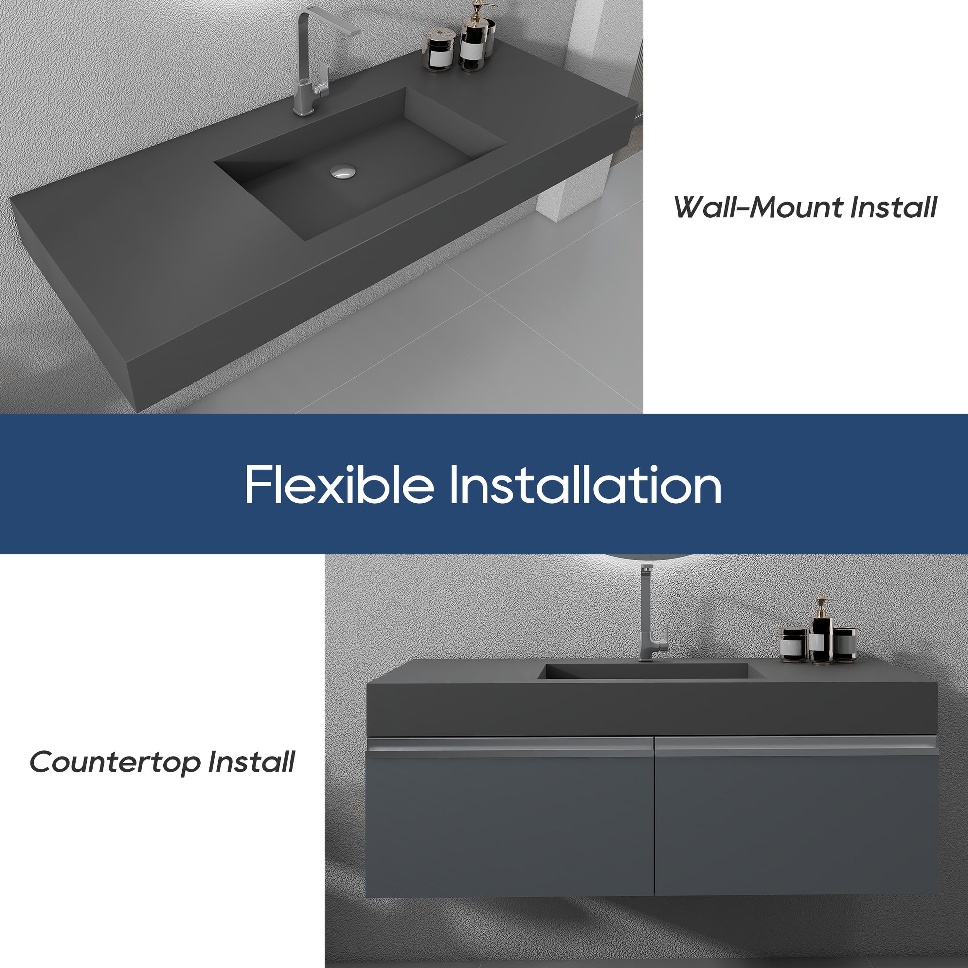 The use of high-quality artificial stone to create, durable and stain-resistant easy to clean, daily simple wipe can keep clean, stubborn stains can be easily repaired with sandpaper. Matte gray tone with smooth lines design, low-key elegant, easy to adapt to a variety of bathroom styles, enhance the sense of space. Wall-mounted installation saves space, no hygienic dead ends, easier to take care of. Combining aesthetics and practicality, it is a quality choice for washroom, bathroom or dressing room.