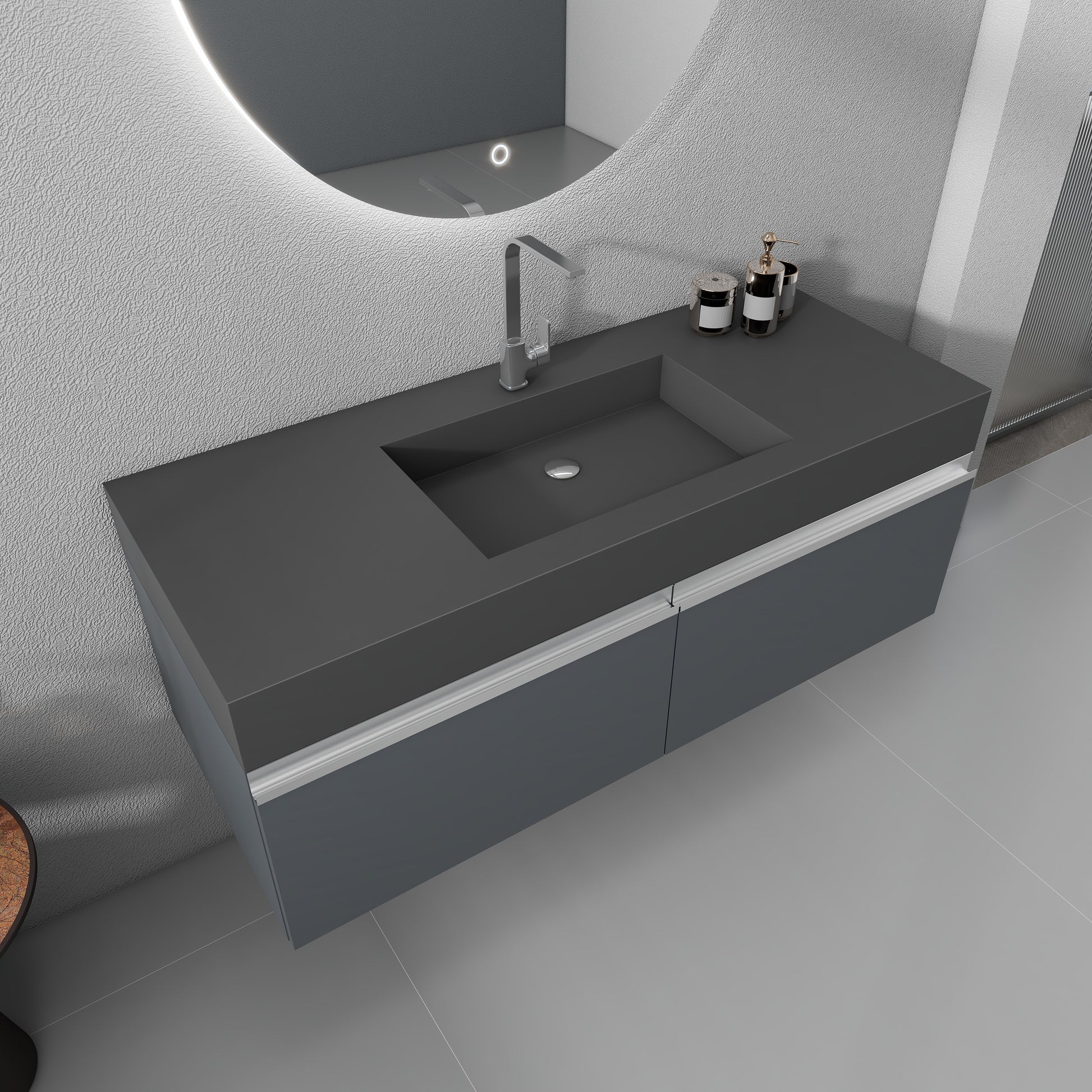- The use of high-quality artificial stone to create a matte gray tone presents a low-key elegant modern matte texture, adding a sense of seniority to the bathroom space.