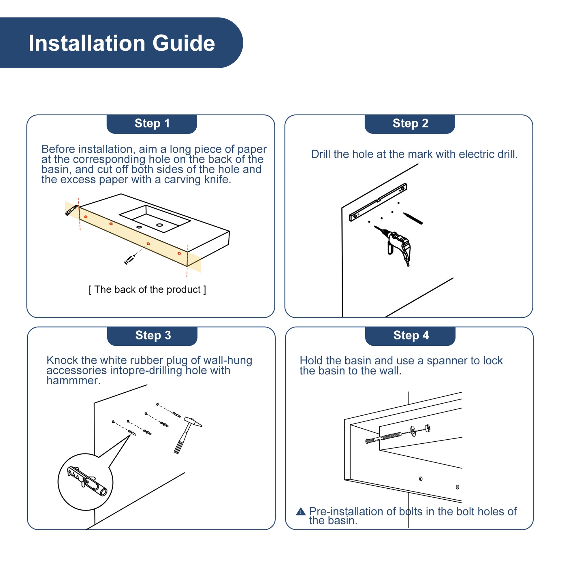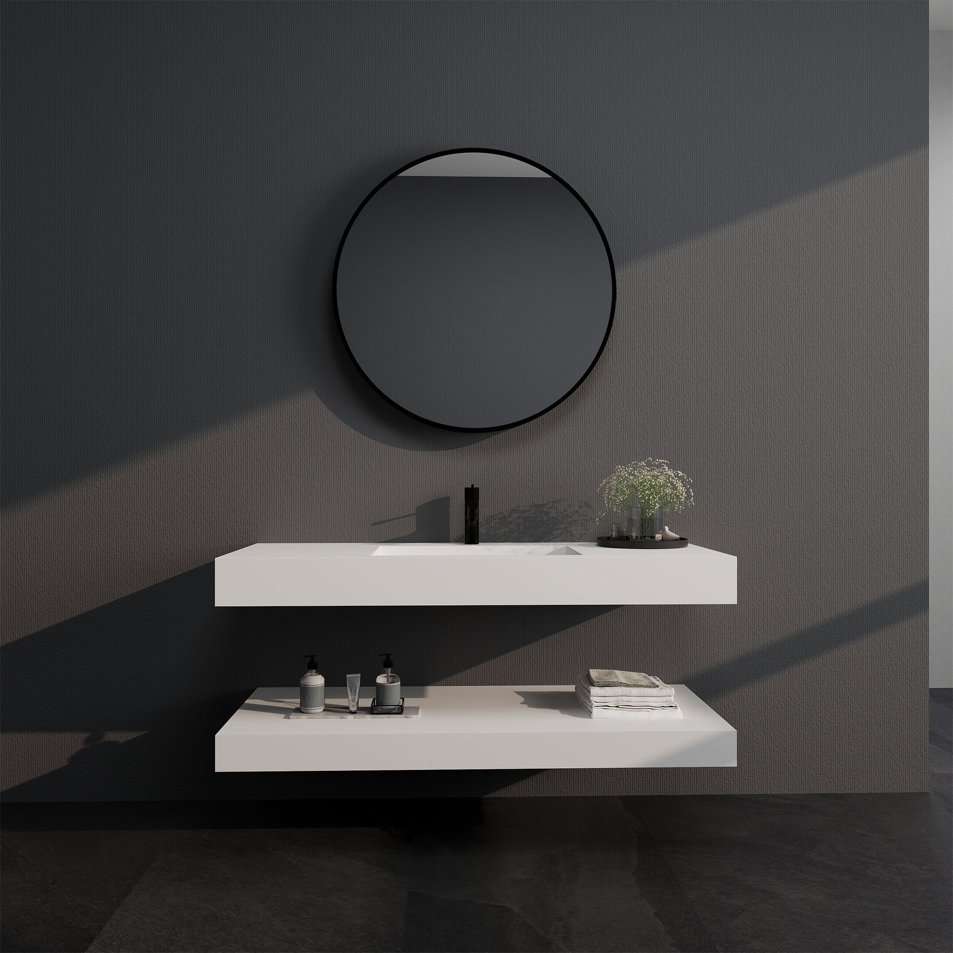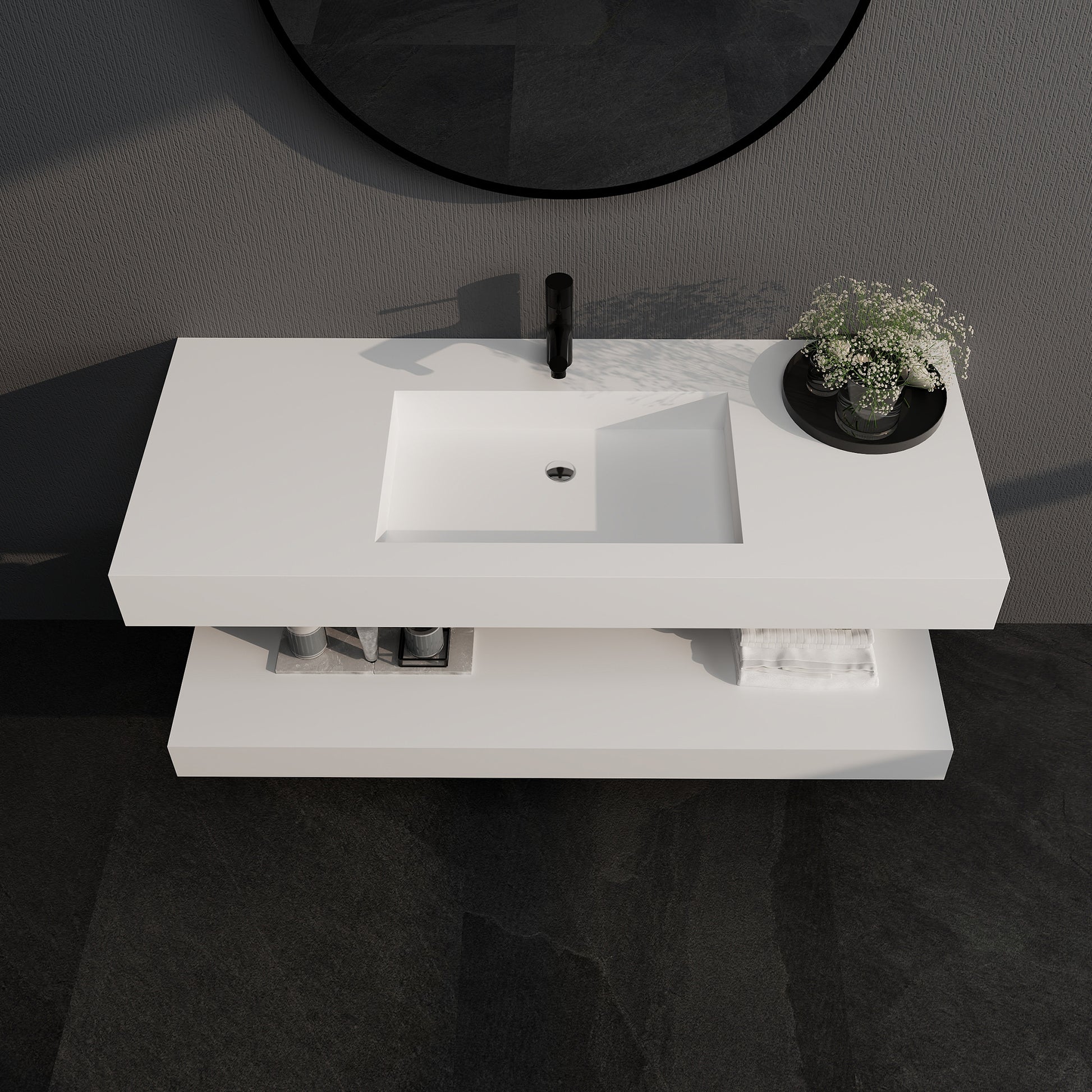 Selected high-quality artificial stone molded in one piece, both stain resistance and durability.47 inches long countertop with shelves, providing large space and convenient storage. The single faucet hole has been pre-opened, and comes standard with a high-quality drain and mounting screws for quick installation. Wall-mounted design saves space and is easy to clean with no hygienic corners. The modern matte texture perfectly fits all kinds of decoration styles, creating a high-end and practical bathroom space for you.