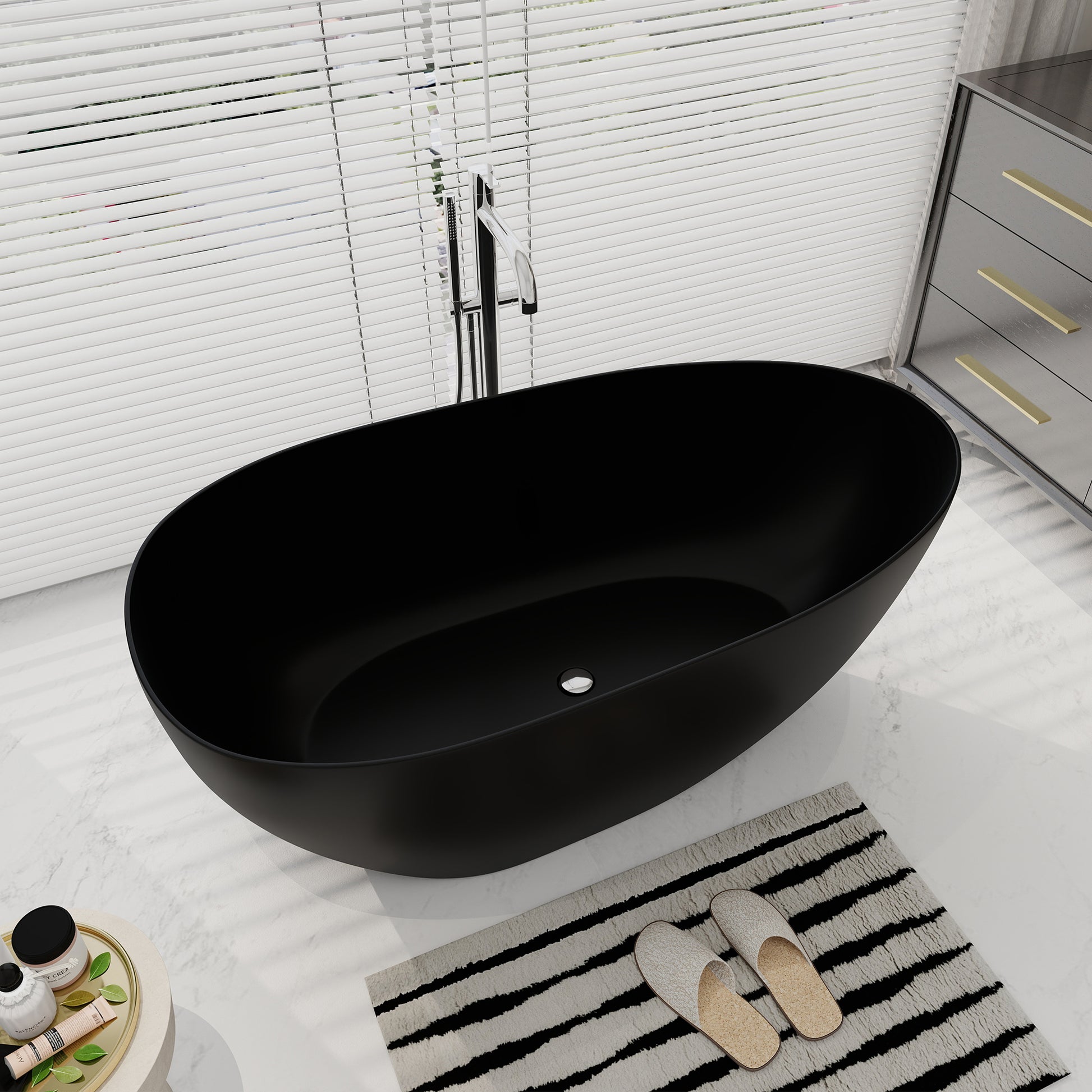 MEDUNJESS surrounds you with tranquility and comfort in this product. This soaking bathtub is modern and made for relaxation. Crafted from 100% eco-friendly handmade Resin Stone, non-porous, 100% fade-resistant, natural stone feel,ensuring durability and strength while remaining non-poisonous. No-slip matte finish and a silky-smooth texture. Our tub conforms to the body's natural contours, Sloped lumbar support offers extra comfort, providing exceptional lumbar and head support for extended relaxation. Its excellent heat retention ensures a long, soothing soak, akin to being cocooned in luxury. Its corner-friendly design makes it ideal for both indoor and outdoor settings, Advanced lightweight pure white stone resin keeps bathwater warm and cozy, while durably resisting any scratches or staining. This freestanding tub is what bathing dreams are made of. Includes pop-up drainer, the bottom outlet is in the center, and the drain hose (not included in the price)
