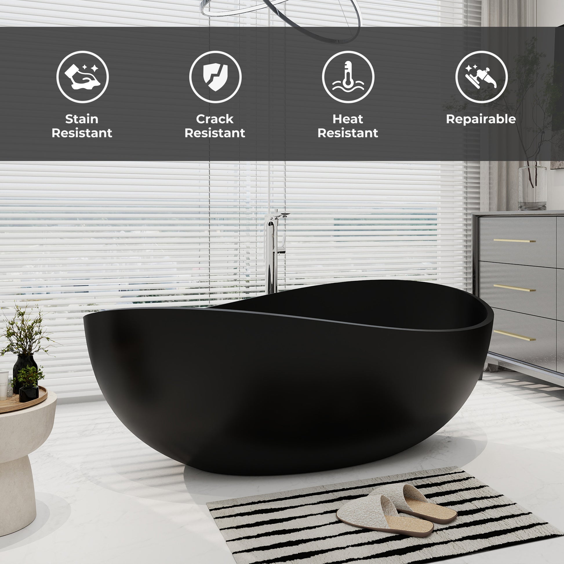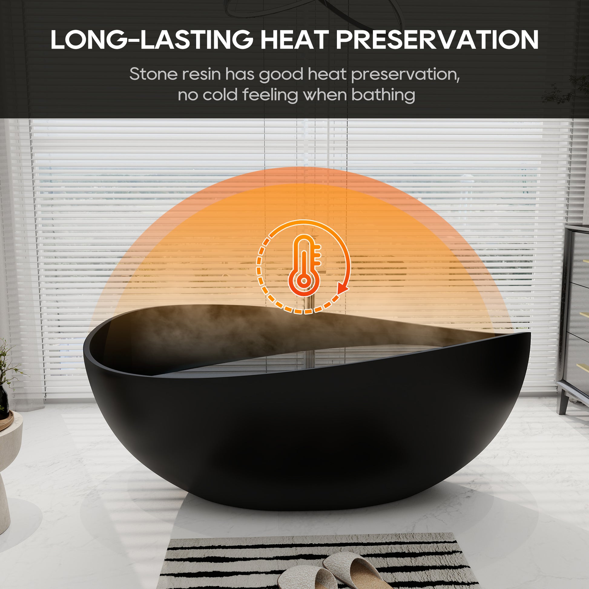 Artistic wave-shaped free-standing bathtub, elegant curved design to become the focus of the bathroom, high-quality non-porous solid surface material both beauty and practicality, 100% environmentally friendly resin stone to create a natural stone pattern to prevent fading. Curved inner wall fits the human body, smooth surface is easy to clean, excellent heat preservation performance makes the warmth lasting. The lightweight white material is scratch-resistant and stain-resistant, making it suitable for both indoors and outdoors. The bathtub includes a pop-up drain with a bottom drain in the center and a drain hose (price extra), adding a sophisticated touch to the modern bathroom and a cocooning, luxurious bathing experience.