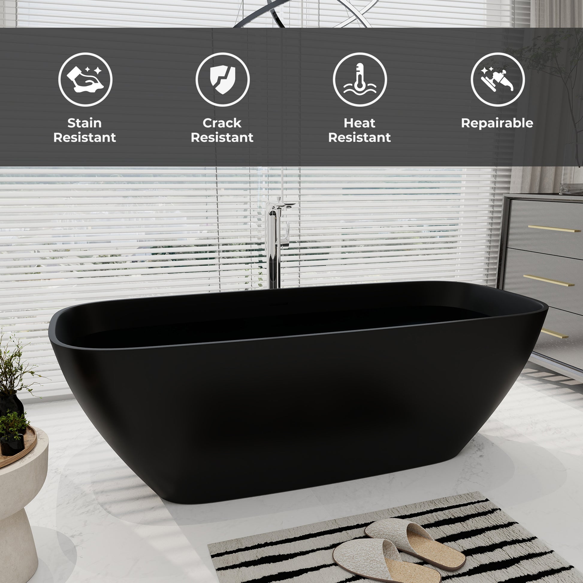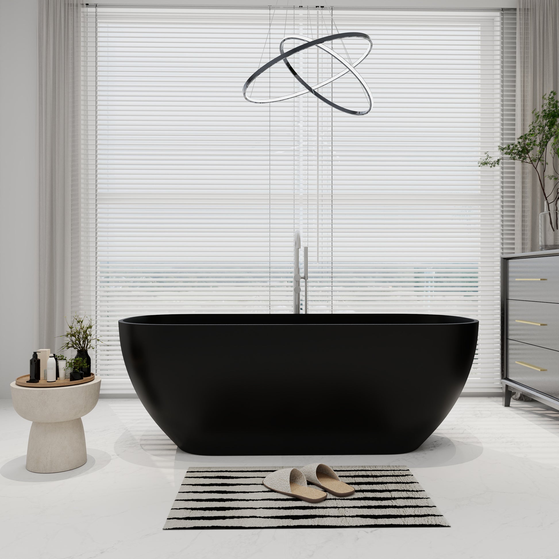 This solid and decent material freestanding bathtub is a perfect blend of luxury and practicality, which is refined with high-density artificial stone. Its excellent material characteristics bring multiple advantages, natural stone-like warm texture, more lightweight and durable; non-porous structure of anti-dirt seepage, daily cleaning a wipe clean. The ergonomic curves are crafted with long-lasting heat preservation, allowing you to enjoy an immersive relaxation experience. The matte non-slip surface is both safe and high quality, while the hand-polished seamless craftsmanship reflects the ultimate pursuit of detail. As the soul of the bathroom, it is not only a functional appliance, but also a work of art that enhances the quality of life. Whether it's a revitalizing shower in the morning or an aromatherapy spa at night, it can bring you a luxurious experience that goes beyond the ordinary.
